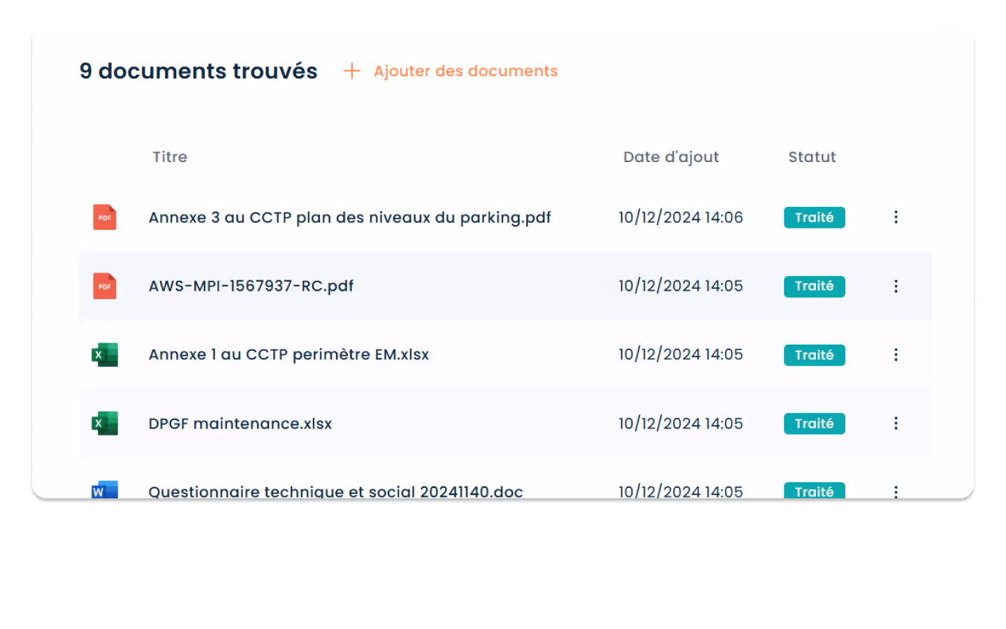 Tenderbolt analyse tous les documents de l'appel d'offres pour vous permettre d'avoir une compréhension parfaite du besoin, en économisant des heures de lecture